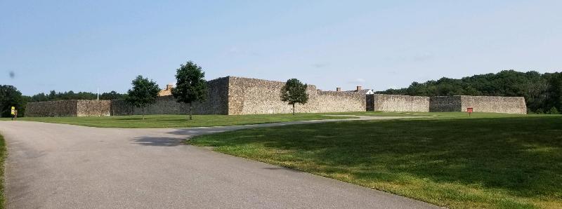 The first 30 km passed boringly by. River on one side, canal on the other, never changing. Still, I felt better than the last couple of days. Bored, but better. Over the years I’ve learned I want lunch at about 30 km. At almost exactly 30 km I passed a sign: “Fully-reconstructed fort. 100 yards.” Who am I to turn down a sign like that? Fort Frederick was constructed in 1763, and played a crucial role in the French-Indian Wars. Now? The walls have been reconstructed, but not the gate. They’re in the process of building new barracks on the interior, and prohibited wandering past the gate during the restoration. Still, a lovely backdrop for lunch.