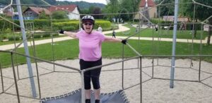 Around the back of that church was a playground. My favorite part was a rope balancing thing with 3 connected trampolines. Rick bounced me and took a photo.