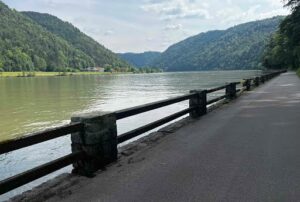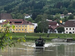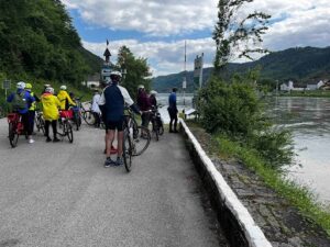 We and several other cyclists took a ferry to the south side of the river. Most of the folks in this picture did not take the ferry and stayed on the north side of the Danube. We later discovered why, as we rode up and down big hills, while looking across the Danube at the flat bike path on the north side, taunting us.