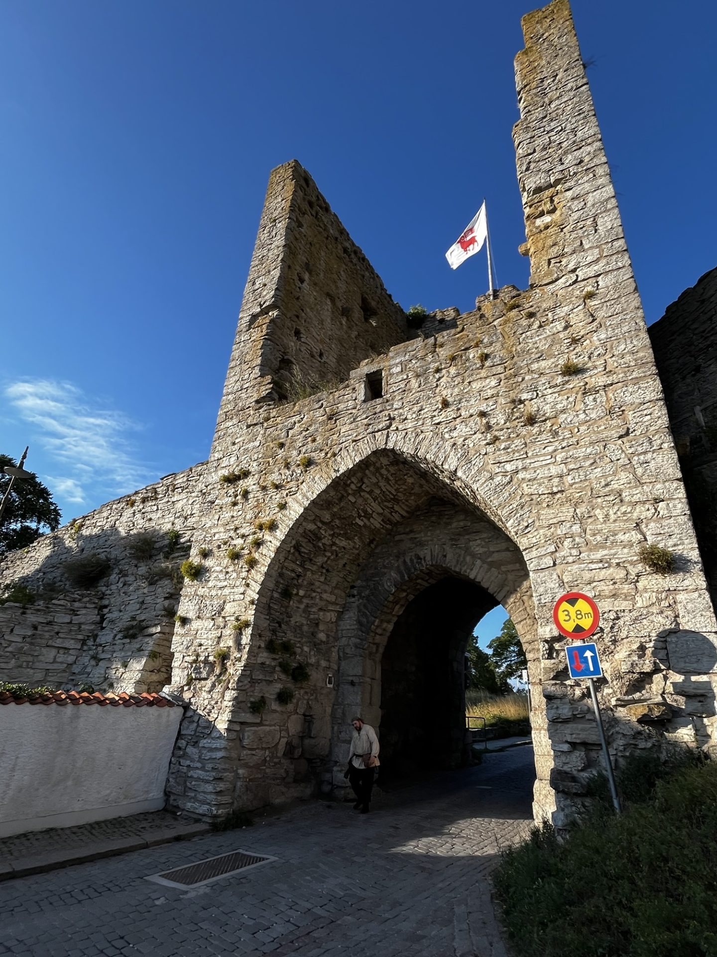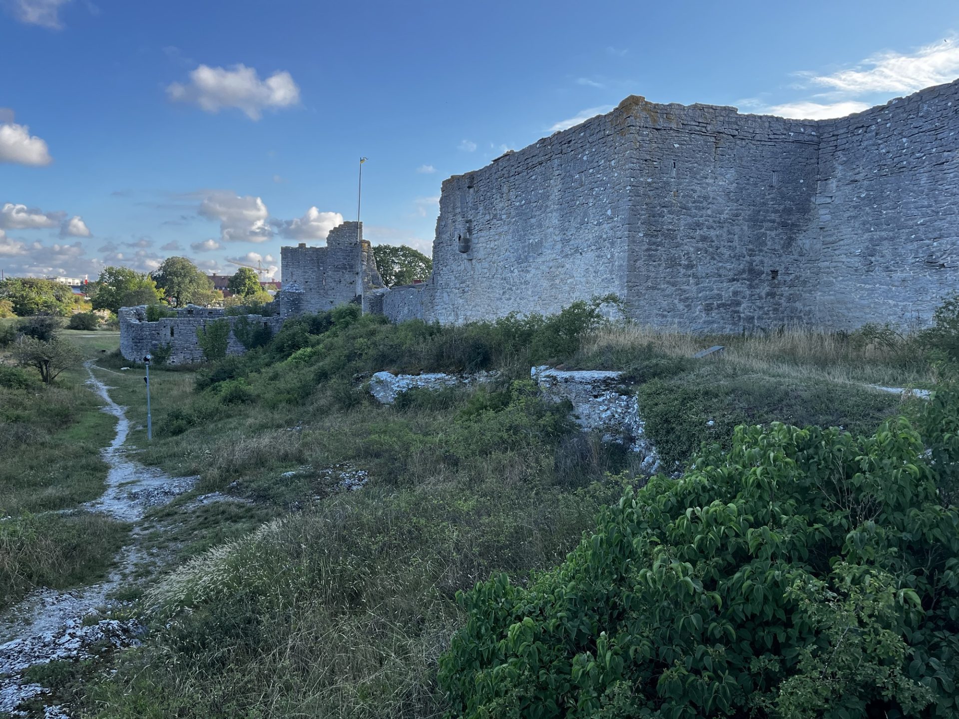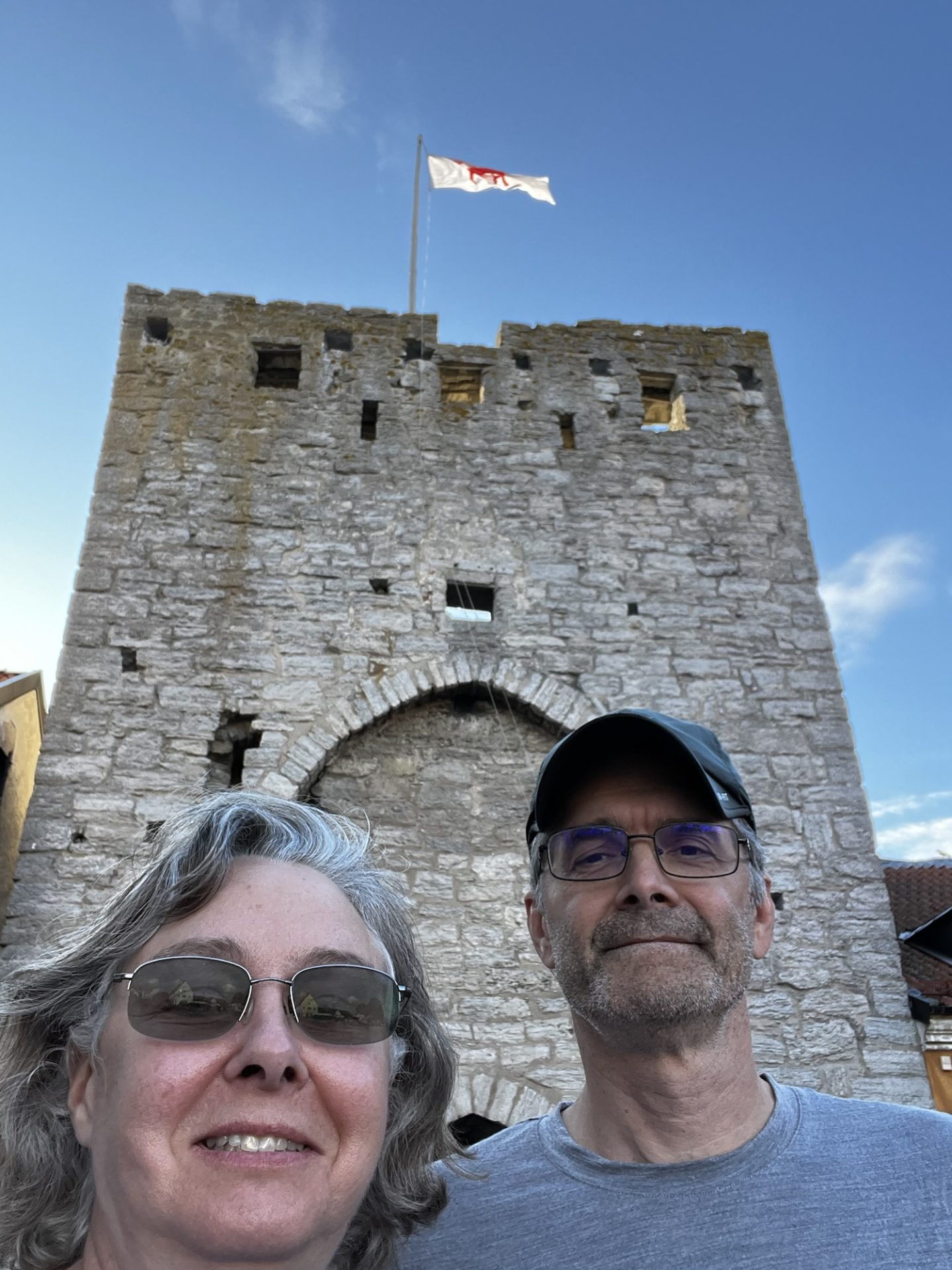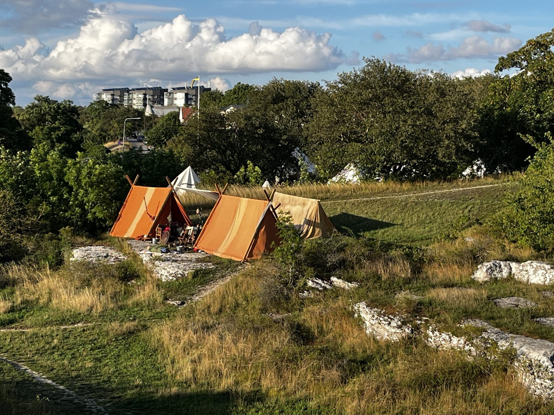 We are here for a medieval festival in honor of the battle of Visby in 1361. The Danish king invaded Gotland and slaughtered about half the males on the island. It happened in a hot summer and they left the dead on the field and eventually buried them in mass graves, leaving their armor on the bodies. When Rick was in the SCA, he made armor based off the archeological dig from that battle. There are reenactments of the Battles of Visby and Masterby. We plan to see the Masterby reenactment.