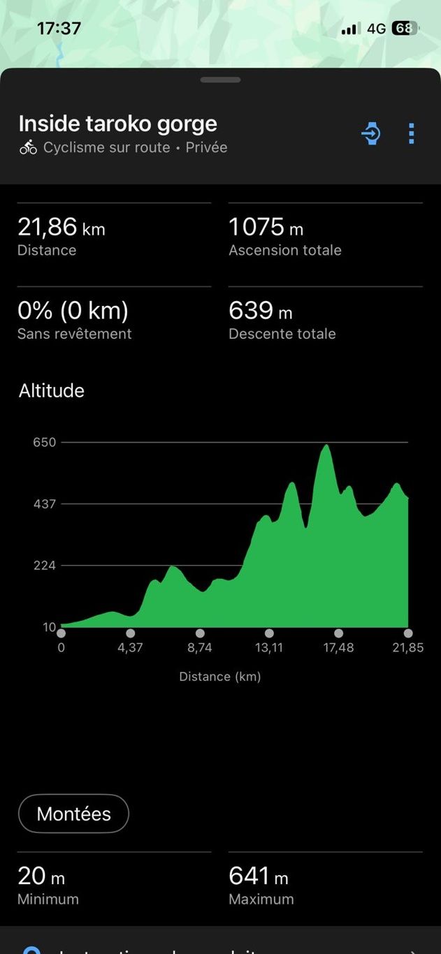 Alex cycled 20 km further today to stage himself for cycling the Taroko Gorge tomorrow, leaving his gear at the hostel. He’s planning the original stage of what would be climbing to Wuling Pass, but cycling to the elevation of 650 m, instead of the total climb of about 3,000 m.