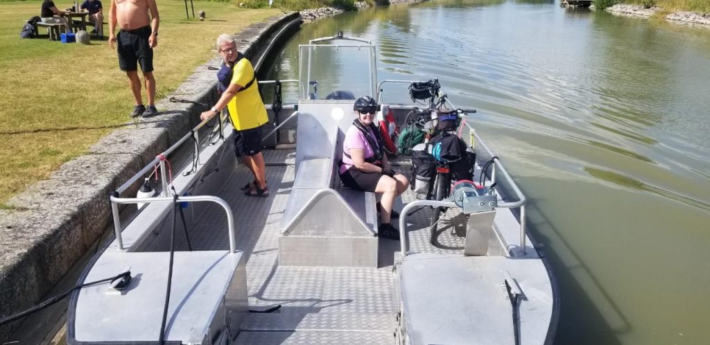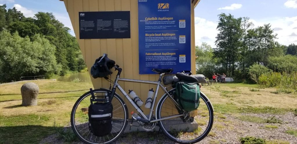 We left Soderkoping at the traditional 10 am. The path out followed a canal with many locks (once three locks back to back!). The path dead-ended into a bicycle-specific ferry that took us 6 km through the canal to the other side.